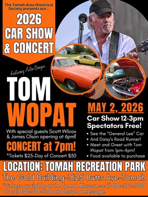 In the evening, enjoy live music starting with special guests Scott Wilcox and James Olson at 6:00 PM, followed by a headline concert from actor and singer Tom Wopat at 7:00 PM. Concert tickets are $25 in advance or $30 the day of the show. Tickets available at the Tomah Museum, call 608-372-1880 or call 608-706-1106 and leave a message.