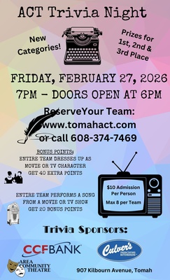 ACT Trivia Night! Lots of new categories. Prizes awarded for top 3 teams! Teams can be up to 8ppl. Cost is $10 per person. Earn bonus points for your entire team dressing up as a movie or tv character for 40 extra points! Or your whole team can sing a song from a movie or tv show for 20 extra points! Doors open at 6pm and the games begin at 7pm! Get your teams together now! Reserve your spot at tomahact.com.