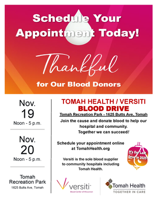 Schedule an appointment online at www.tomahhealth.org or call 877-232-4376 for additional details. Versiti is the sole blood supplier to community hospitals including Tomah Health.