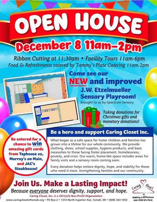 Join the Caring Closet for their Ribbon Cutting and Open House on December 8, 2025 from 11am to 6pm. Come tour their new space, enjoy light appetizers and refreshments catered by Tammy's Plate Catering, and check out their new and improved J.W. Etzelmueller Sensory Playroom! Be entered for a chance to win amazing gift cards from Taphouse Twenty, Murray's On Main, and JAC's Steakhouse. The Caring Closet will also be taking donations for Christmas gifts and monetary donations.