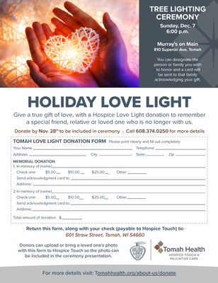 We invite you to join us for our Tree Lighting Ceremony on Sunday, December 7, 2025, at 7:00 p.m. to remember a special friend, relative, or loved one. Give a true gift of love, with a Hospice Love Light donation to remember a special friend, relative or loved one who is no longer with us. Donate by Nov. 28th, 2025, to be included in the ceremony. Return donation form, along with your check (payable to Hospice Touch) to 601 Straw Street, Tomah, WI 54660. Donors can upload or bring a loved one’s photo with this form to Hospice Touch so the photo can be included in the ceremony presentation.