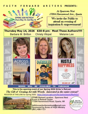 At the Faith Forward Writers Retreat Spring 2026, during their opening night, the public is invited to meet with authors Barbara M. Britton, Christy Wopat, and Melanie Lee, as they share about their recent books: "Across the Lake" by Barbara M. Britton; "Overruled" by Christy Wopat; and "Hustle Happiness" by Melanie Lee. This event is open to the public.
