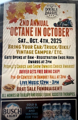 "Octane in October": Gates open at 8am. Registration ends at noon with awards at 2pm. Live music from 12-3pm. Enjoy brat sale fundraiser. All proceeds benefit Bulff and Ridge Equine Assisted Therapies.