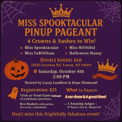 Join Double Barrel Bar for their "Miss Spooktacular Pinup Pageant" held during their 2nd Annual "Octane in October" event! Don't miss this frightfully fabulous event!