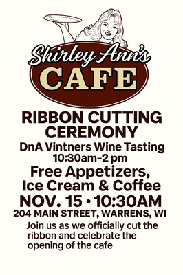 Join us for the Grand Opening of Shirley Ann's Cafe in downtown Warrens (204 Main Street) on Saturday, November 15th, 2025. We will have a ribbon-cutting ceremony with Shirley Ann Pawlak, the cafe's namesake, at 10:30 a.m.